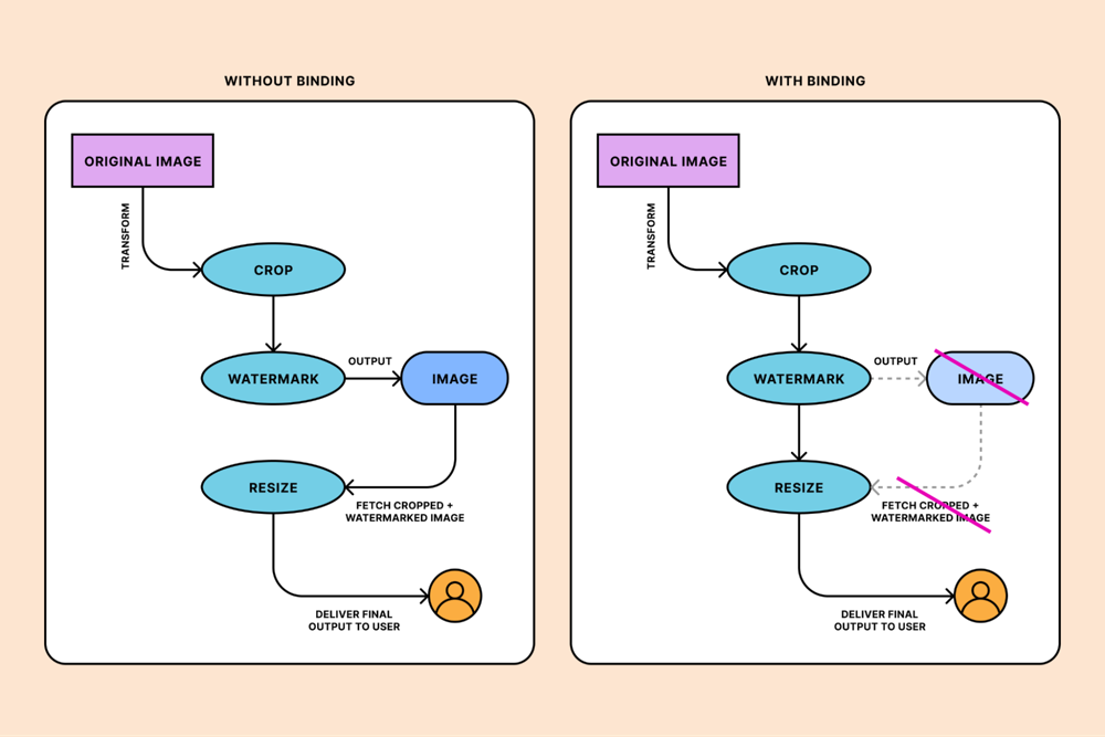 Figure: Using the Images binding on Cloudflare Workers (right) lets you chain image operations in one request. Without the binding (left) you’d need multiple fetch/transform steps; with the binding, transforms (crop, watermark, resize, etc.) occur in a single workflow.