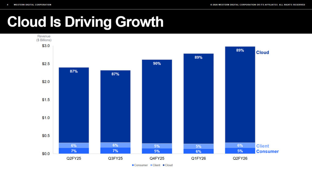 Western Digital emphasized that this growth is tied to AI and data-center demand. As CEO Irving Tan noted, the quarter “reflects our disciplined execution to meet demand in the AI-driven data economy,” and WD is focused on delivering “reliable, high-capacity HDDs at scale” to large cloud customers. Indeed, cloud/nearline customers now account for nearly 89% of WD’s revenue, and WD shipped over 3.5 million of its newest high-capacity drives (up to 26 TB CMR and 32 TB UltraSMR) during the quarter. These drives support AI and “multimodal” data workloads, helping to boost both revenue and gross margins (which are up ~770 basis points YoY).